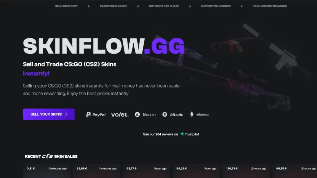 Skinflow nutzt einen hybriden Flow: Du zahlst Cash/Krypto ein, um Guthaben für Käufe oder Bot-Trades aufzubauen, oder du instant-sellst Items für sofortiges Guthaben und zahlst dann auf unterstützte Rails aus. Einzahlungen funktionieren via Krypto, PayPal und Karten. Auszahlungen unterstützen Krypto, PayPal, Payoneer und Volet.